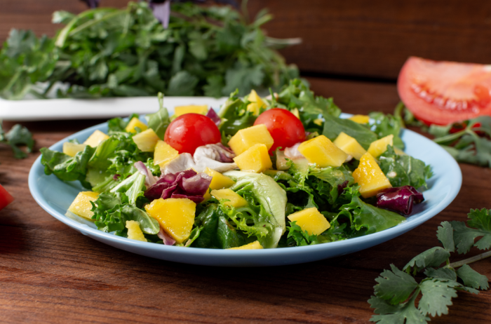 Salada refrescante de folhas com manga e molho cítrico