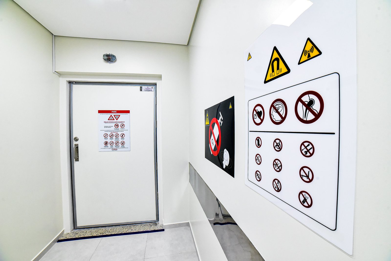 Avisos na entrada da sala de ressonância magnética do Hospital de Base reforçam os cuidados necessários com o equipamento. Agência Brasilia