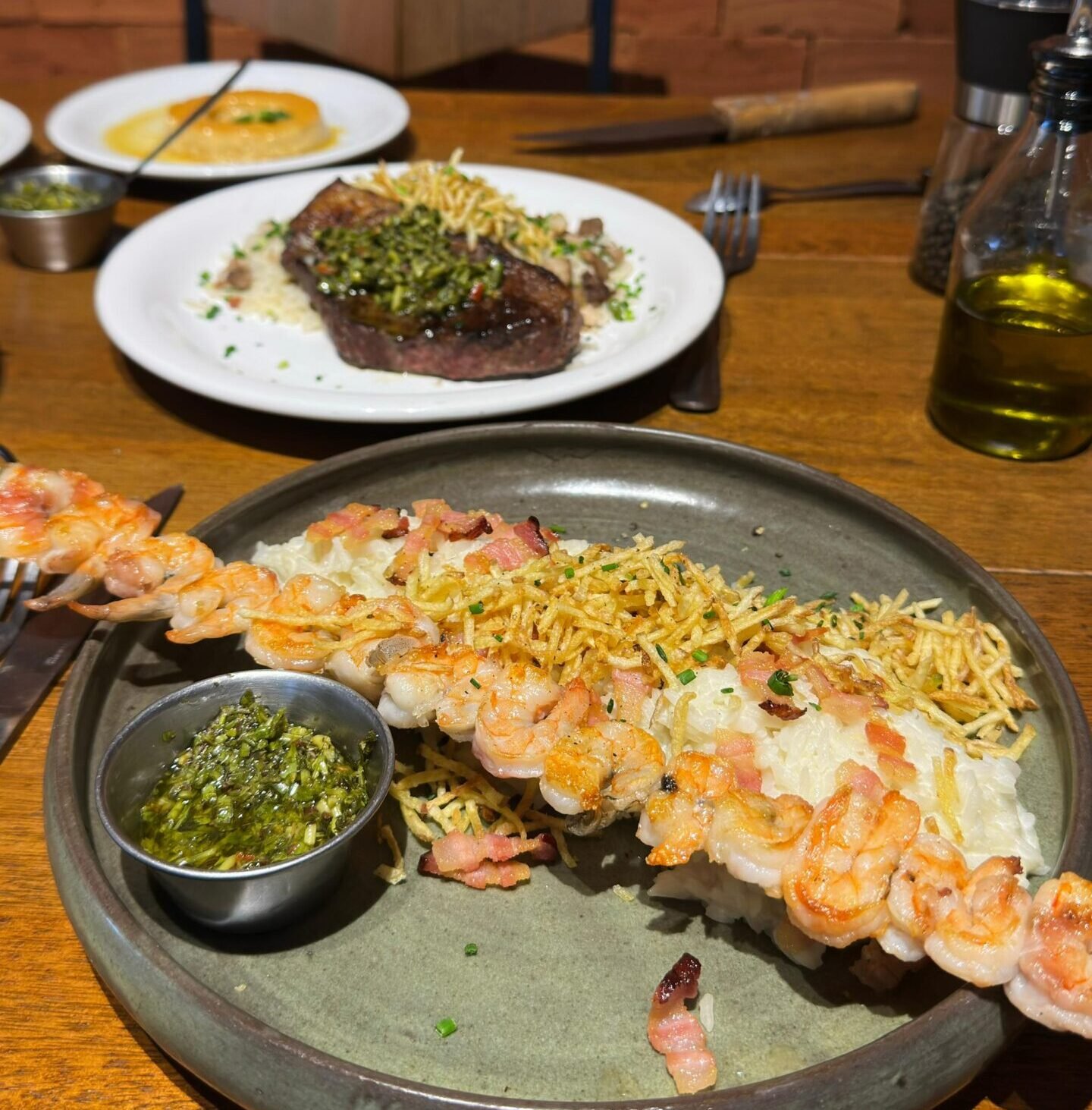 Já no jantar, o cardápio ganha ainda mais robustez. As entradas seguem as mesmas do almoço, mas os pratos principais apostam em sabores fortes: a picanha ao chimichurri, acompanhada de arroz do churrasqueiro e batata palha, ou o camarão no espeto, servido com arroz cremoso com bacon e batata palha. A sobremesa mantém a dupla que conquista todos os paladares: pudim ou petit gateau.