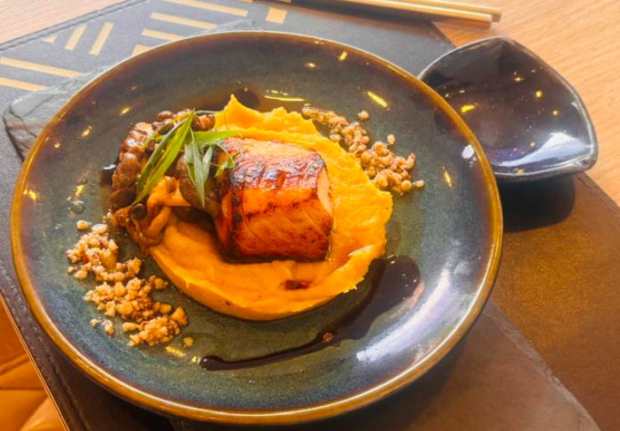 O prato é o Bacalhau Negro ao Missô Noru, um carnudo lombo de bacalhau negro marinado por 48 horas em missô, grelhado até atingir textura amanteigada e levemente caramelizada. Servido sobre purê sedoso de batata-baroa com toque sutil de azeite, acompanhado de shimeji salteados. Finalizado com redução delicada de saquê, mirin e shoyu japonês, crisp rendado crocante, raspas de limão siciliano e flor de sal.