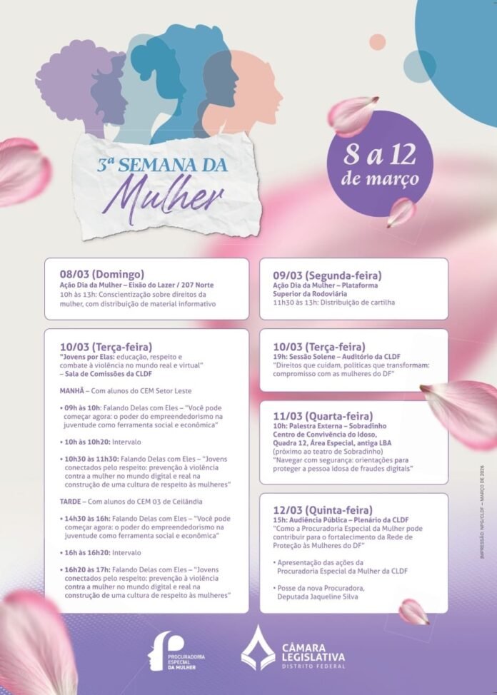 Entre os destaques da programação está o projeto “Jovens por Elas”, que promove diálogo com estudantes do Centro de Ensino Médio Setor Leste e do Centro de Ensino Médio 03 de Ceilândia sobre respeito, empreendedorismo e prevenção à violência contra a mulher, tanto no ambiente digital quanto no cotidiano. A agenda também inclui sessão solene na Câmara Legislativa, palestra externa e audiência pública voltada ao fortalecimento da rede de proteção às mulheres no Distrito Federal.